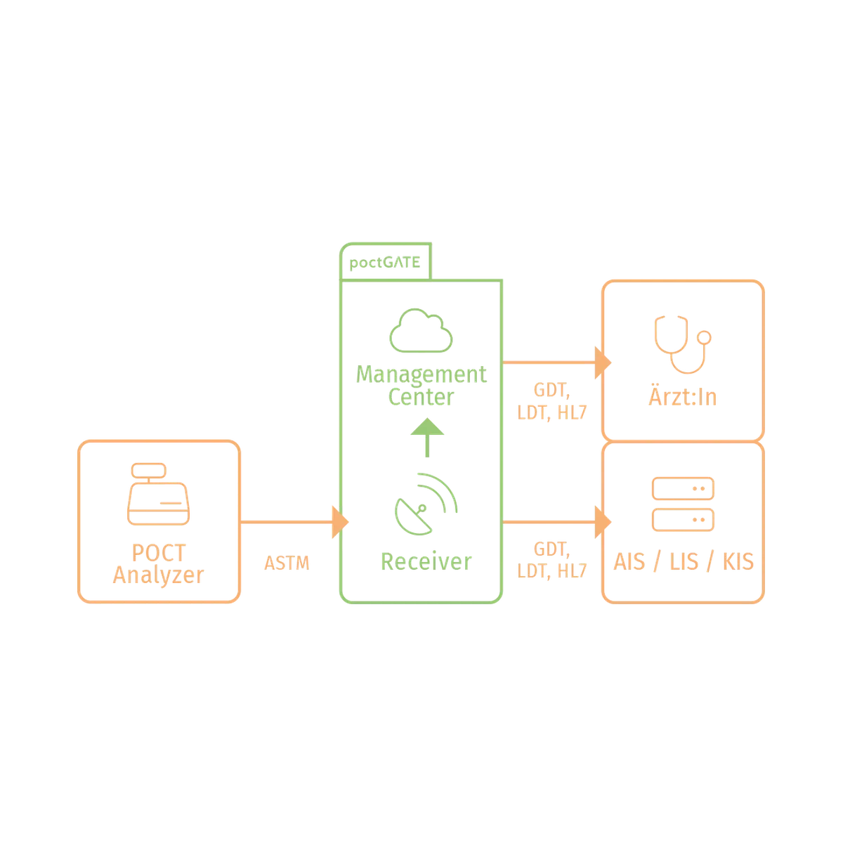 Der poctGATE Receiver ist eine Schnittstelle, die den Austausch zwischen gängigen Krankenhaus-, Labor- und Arztinformationssystemen und POCT-Analyse-Geräten organisiert und Messergebnisse in Echtzeit überträgt.